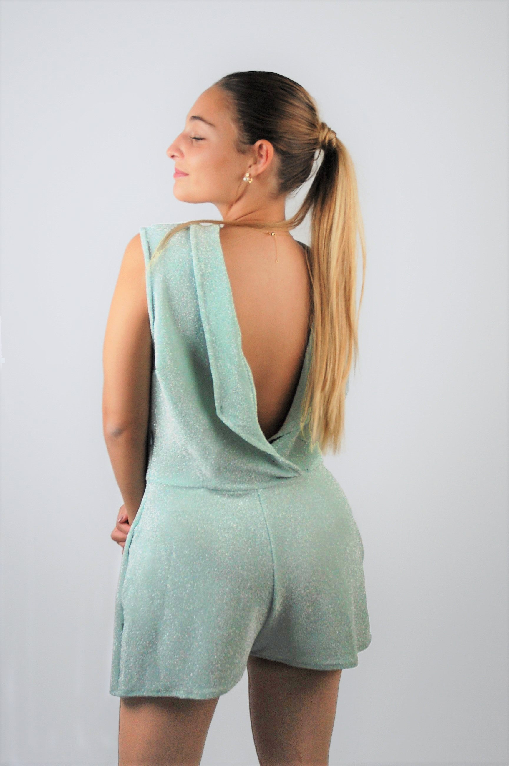 Designed in our Lurex fabric this jumpsuit features a collared neckline and a sexy short hemline. You can reverse it and wear the front ti show a low back if you are in the mood to give a twist.